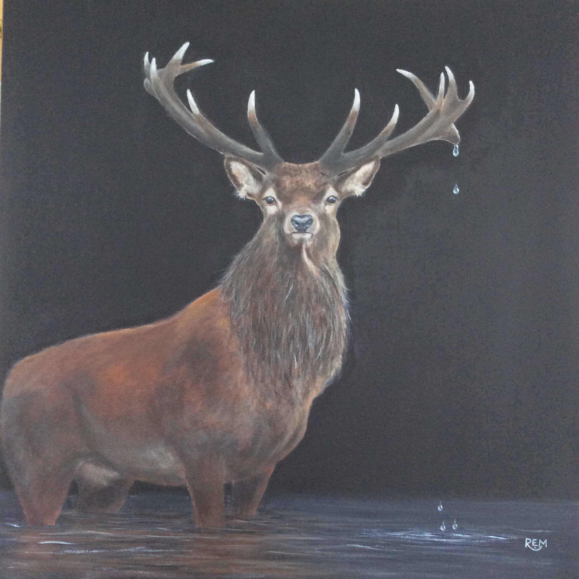 Just finished this stag but keep fiddling with the water so it’s time to clean the brushes and take the painting off the easel. Acrylic on canvas 60 x 60cm.