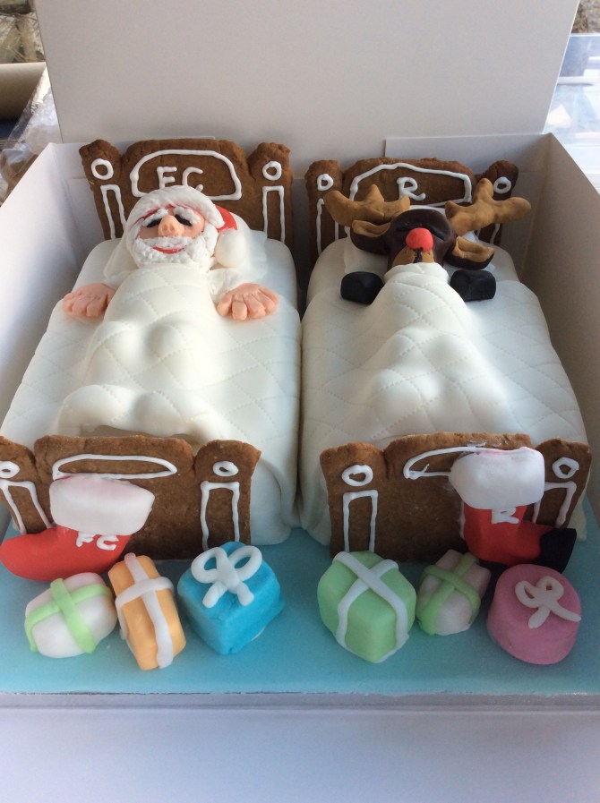 Given the job of providing the Christmas cake this year and keeping everyone happy, (some prefer fruit cake, some prefer sponge cake and some might just nibble a bit of gingerbread) – this is the end result. Santa is a traditional fruit cake, Rudolph is a Vicky sponge and the bedsteads are gingerbread! The wobbly icing is due to a festive sherry….or three. Happy Christmas 🎄