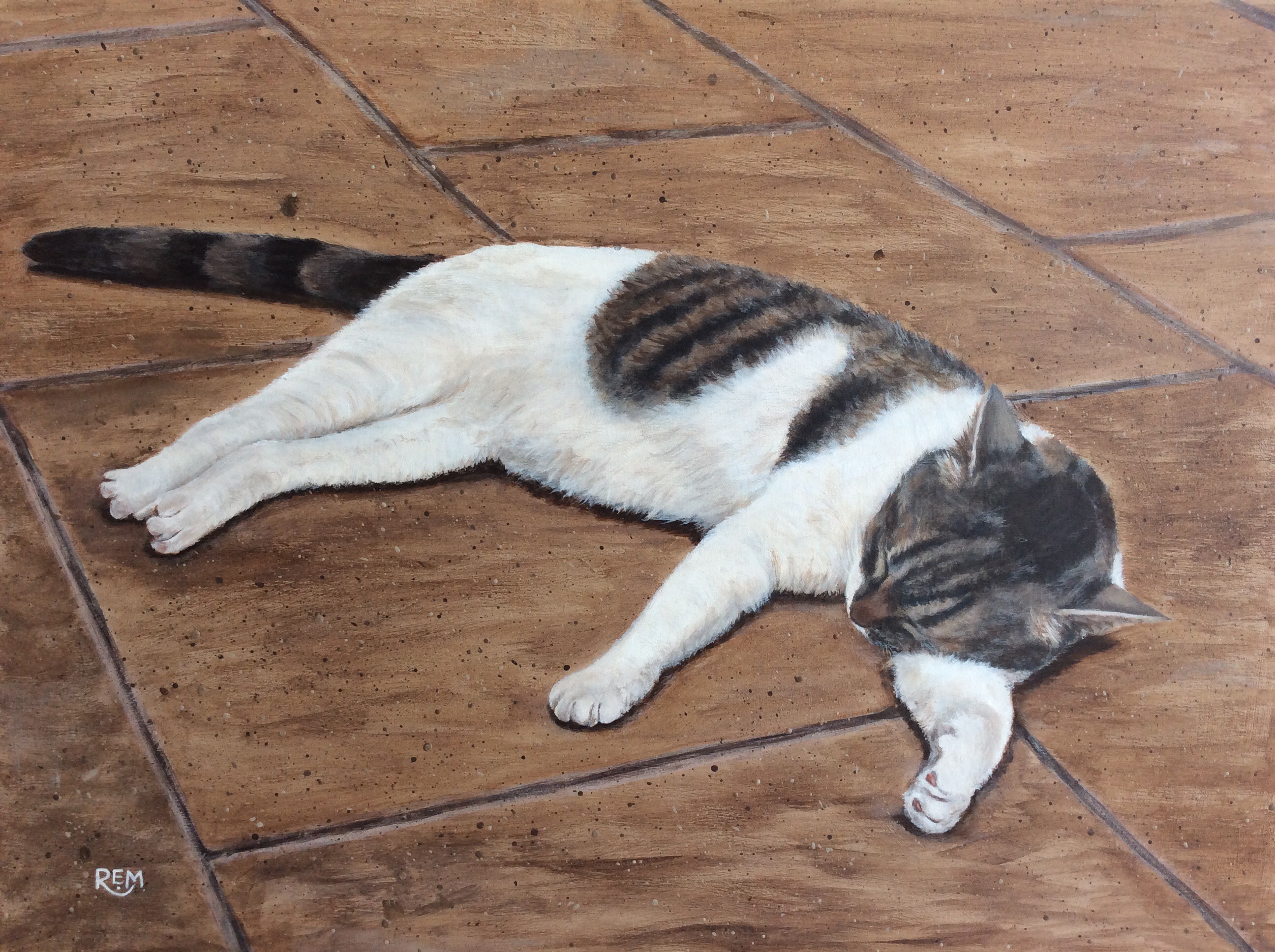Here’s a rejigged painting which has been lying around the studio for a few months. ‘Siesta’ is taken from a holiday photo of a Croatian cat enjoying a sleep right in the middle of a pavement, she obviously knew that there wouldn’t be much pedestrian traffic during siesta time. Bit of fun doing this one, flicking paint at the canvas with an old toothbrush 👩🏻🎨