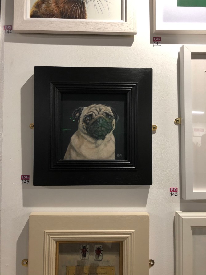 I was delighted to spot my little pug, sharing wall space with other small paintings by artists I greatly admire.  I hope he enjoys his time at this exhibition and maybe, just maybe, he might be lucky enough to find a new home.